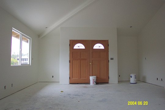 A shot of the living room taken from the dining room. The alcoves to either side of the front door will have built-in book and knickknack cases with solid and glass doors. The cases will contain low-wattage heating bars, very common in these parts for keep the humidity under control. We plan to keep many of the books in there so they don't turn green and fuzzy after a couple of years. |
