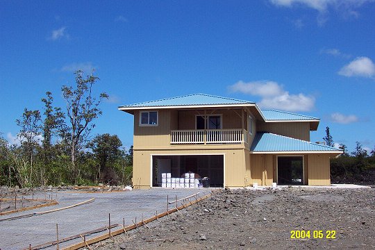 | Most of the exterior paint work is done in this photograph. The sheetrock contractors are still hard at work inside, and they have piled their cans of wall compound in the doorway of the garage. It's striking how much the open garage door looks like a mouth with a lot of missing teeth. | |