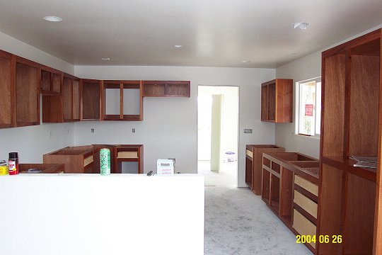 Big progress on the kitchen, too. The sink and dishwasher will be to the right, the range and microwave to the left, and the refrigerator straight ahead to the left of the door. We were hoping to have cabinets made of Koa, an indigenous tree that has gorgeous hard wood, but it was just too pricey. Mango wood is also beautiful, but it's nearly as expensive. In the end, we used African Mahogany, which looks a lot like Koa but is a fraction of the cost. |