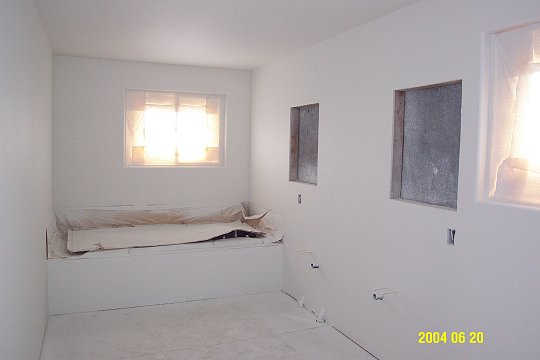 Big changes in only 6 days! The whole master suite was painted light blue, and the bathroom cabinets were partially installed. You also get a better view of the whirlpool bath at the back. That will be covered with cobalt blue bath tiles soon. The painters have finished, so it's safe to take the coverings off everything. The plywood floor is a bit of a mess due to the painting, but it will be covered by floor tiles soon, anyway, so everything's hiki no (all right). |