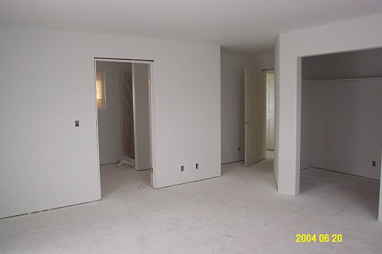 | This is our master bedroom. The walk-in closet is to the right and the door leading to the master bathroom is just left of center. You can't see it in this shot but there is a lanai off camera to the left that looks out onto our front yard. On clear days we will have really nice views of both Mauna Loa and Mauna Kea. There are 13 world class astronomical optical and radio telescopes up on the peak of Mauna Kea, and you can actually see three of them from our house. Of course, that means they can see us, so I guess we'd better keep the bedroom blinds closed. | |